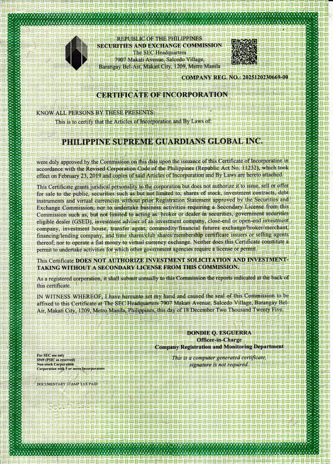 Philippine Supreme Guardians Global Inc. (PSGGI - Bagwis) is part of the Guardians Brotherhood, focusing on fraternal unity, social development and humanitarian service.